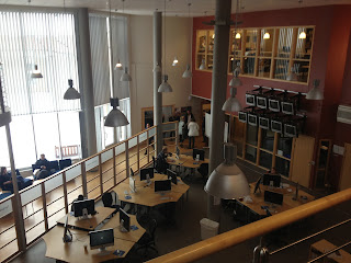 Här sitter studenter vid datorer och bedriver både enskilt arbete och grupparbete. Även läsplattor förekommer som verktyg i lärandeprocessen. Eget bearbetande både i det egna tänkandet och i interaktion med andra. Man kan tillämpa både kognitivt och sociokulturellt tänkande i båda det enskilda arbetet och grupparbetet. Denna miljö möjliggör många sorters lärande, men ett hinder kan vara distraherande hemsidor som till exempel facebook. För att förbättra rummet skulle man kunna ha någon sorts skiljeväggar i en del av rummet så man kan arbeta mer ostört. Det skulle även vara bra med hörlurar vid varje dator.